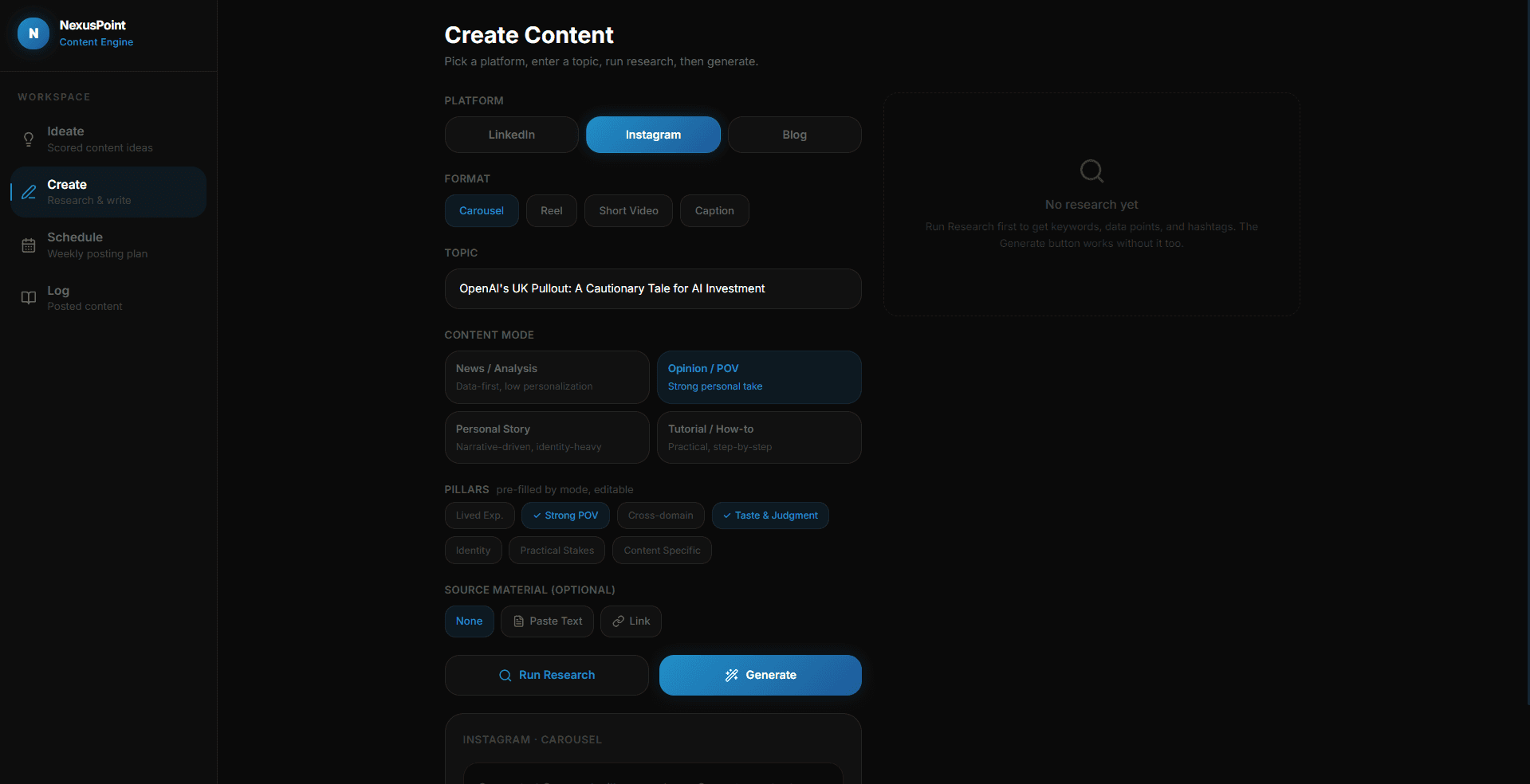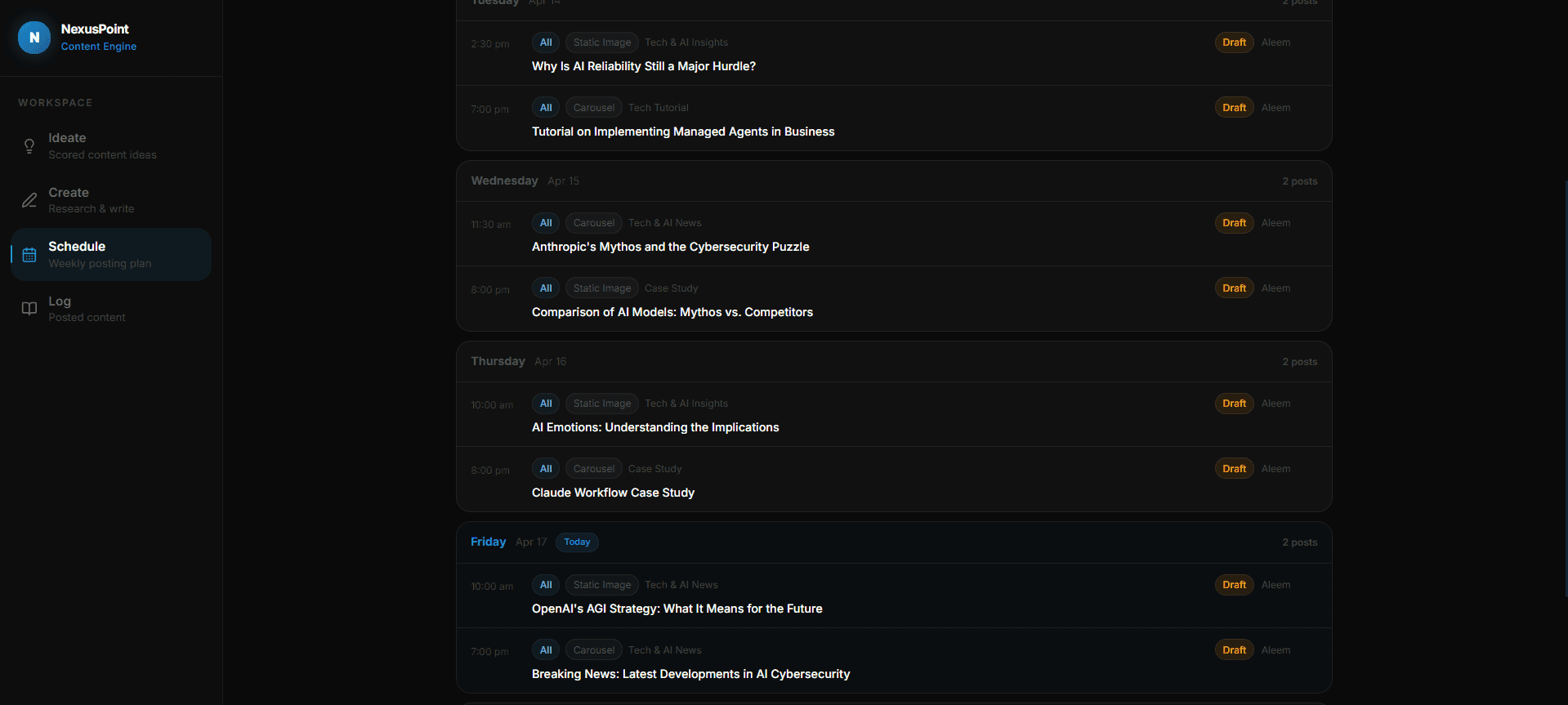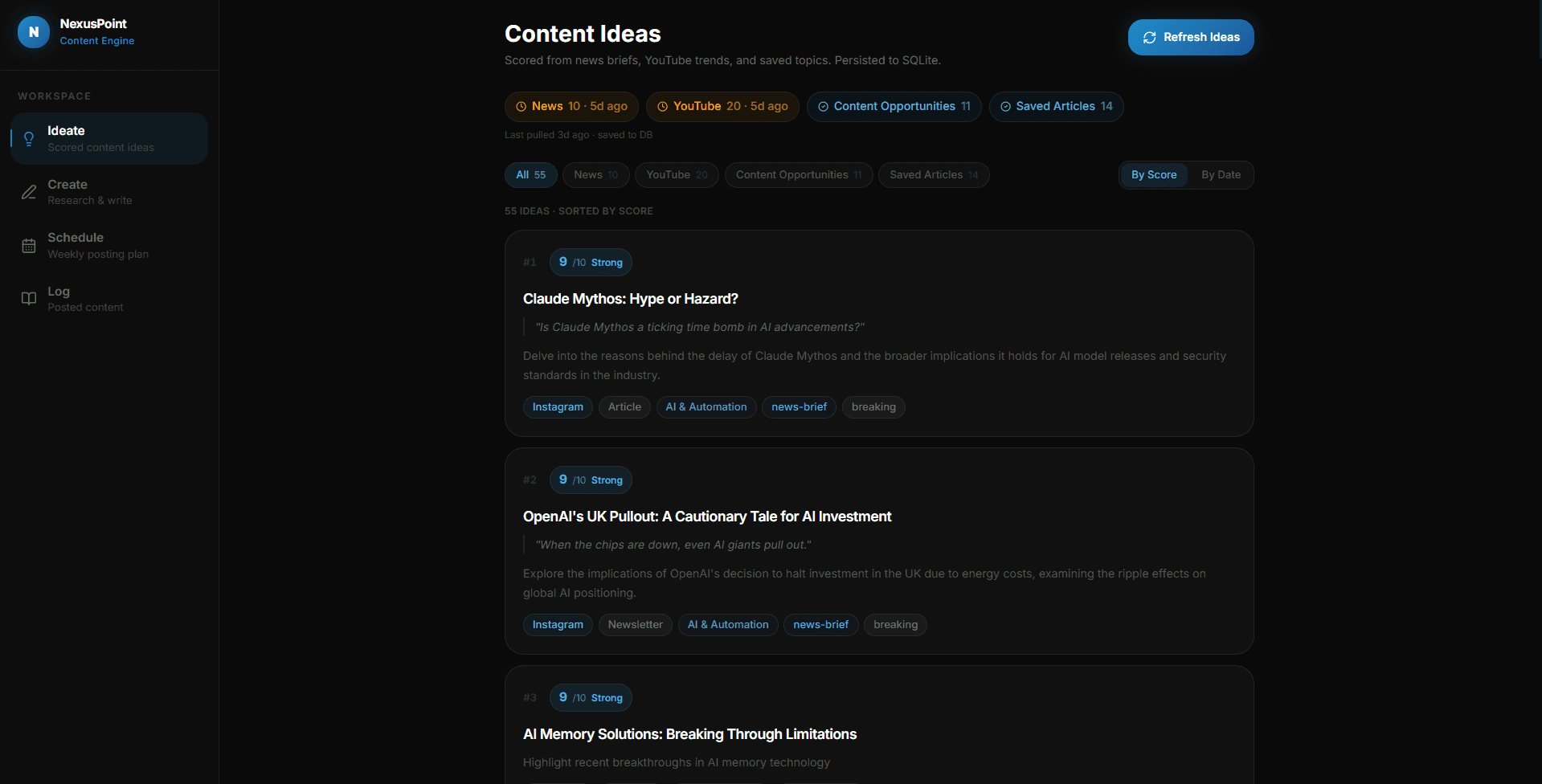 I engineered a full-stack Next.js dashboard and custom Claude skill that acts as an end-to-end content operating system. This infrastructure eliminates manual bottlenecks by hardcoding the client's unique brand voice and automating the entire pipeline from ideation to publishing. Workflow Overview: Automated Idea Discovery: The system scrapes and centralizes topics from multiple data sources, instantly assigning a 10-point viability score based on timeliness, momentum, and competition. Live Research & Generation: Before drafting, the engine conducts live web research to identify SEO gaps, ensuring the generated content is highly relevant and platform-native. Seamless Scheduling & Archiving: With a single click, the system bypasses manual entry, instantly syncing the finalized draft into a Google Sheet calendar and archiving it in a Google Doc. The Repurposing Flywheel: A natural language command executes a full content run, automatically transforming a 1,500-word core blog post into native LinkedIn posts and Instagram carousels.