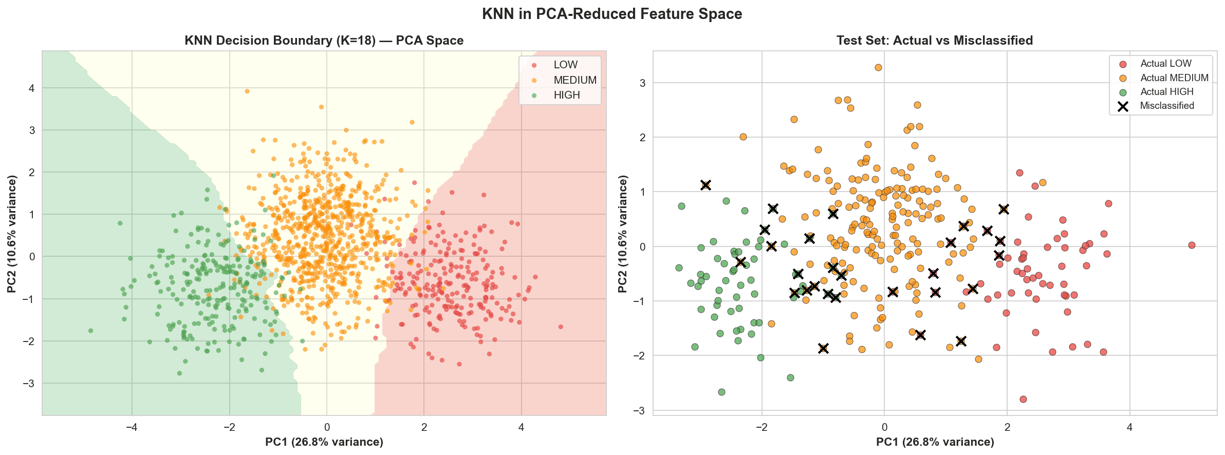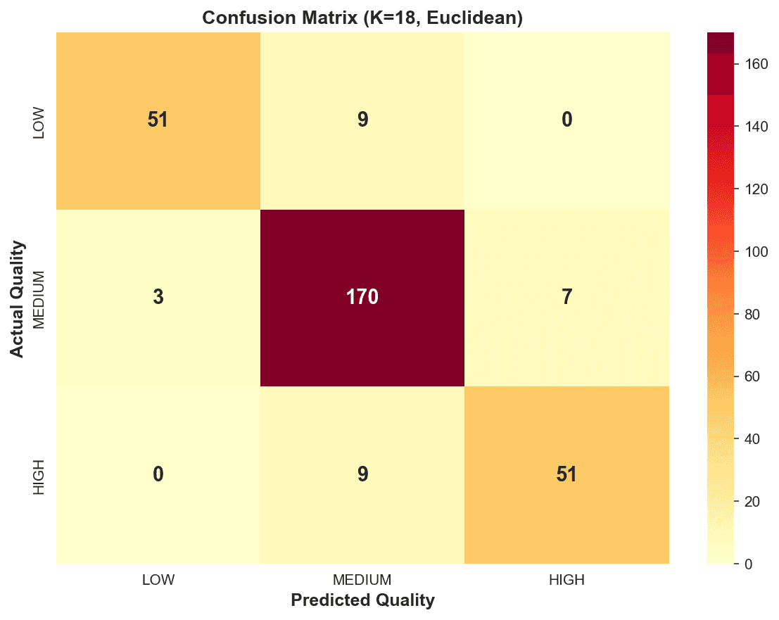 The model proved that chemical "neighborhoods" are highly accurate predictors of taste: Optimal Accuracy: Achieved a 93.2% Cross-Validation Accuracy at $K=18$. * High Precision: The model correctly identified 170 out of 180 Medium-tier wines in the test set, with near-zero confusion between "Low" and "High" tiers. Confidence Insights: Analysis showed that most "Correct" predictions had a confidence score $>0.9$, while "Wrong" predictions were clustered in the 0.5–0.6 range, signaling "borderline" chemical profiles. Zero-Training Latency: As a "lazy learner," the model required no lengthy training phase, allowing for instant classification as new lab results arrive.
