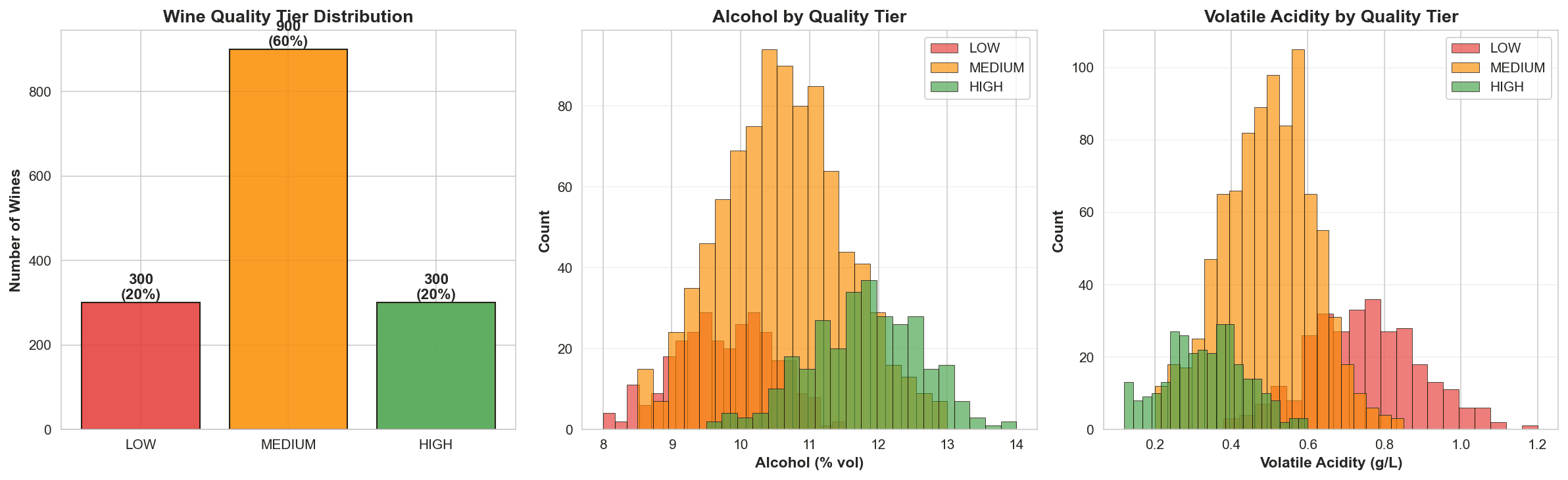 The client, a boutique winery, needed a precise, data-driven method to classify wine quality into three distinct tiers (Low, Medium, and High) based on chemical laboratory measurements. The objective was to eliminate subjective bias and leverage "chemical similarity" to predict how a wine would be rated by experts.