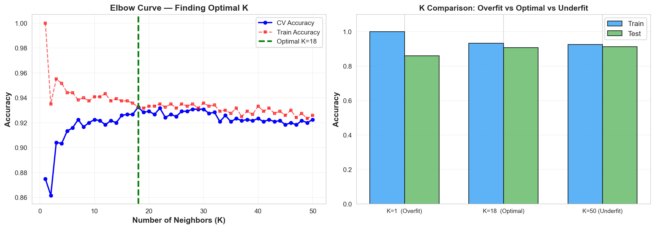 Workflow Overview: Exploratory Data Analysis (EDA): Visualized distributions showing that Higher Alcohol and Lower Volatile Acidity (vinegar-like traits) are strong indicators of the "High" quality tier. Feature Standardization: Since KNN relies on Euclidean distance, I used StandardScaler to ensure that features like Total Sulfur Dioxide (mg/L) didn't mathematically overwhelm features like pH or Density. Hyperparameter Optimization (The Elbow Method): Ran a recursive loop testing $K$ values from 1 to 50. Identified Optimal $K=18$ to balance the model—preventing it from being too sensitive to noise (low $K$) or too generalized (high $K$). Confidence Mapping: Generated a probability distribution to identify which "Medium" wines were borderline "High," allowing the client to refine their blending process.