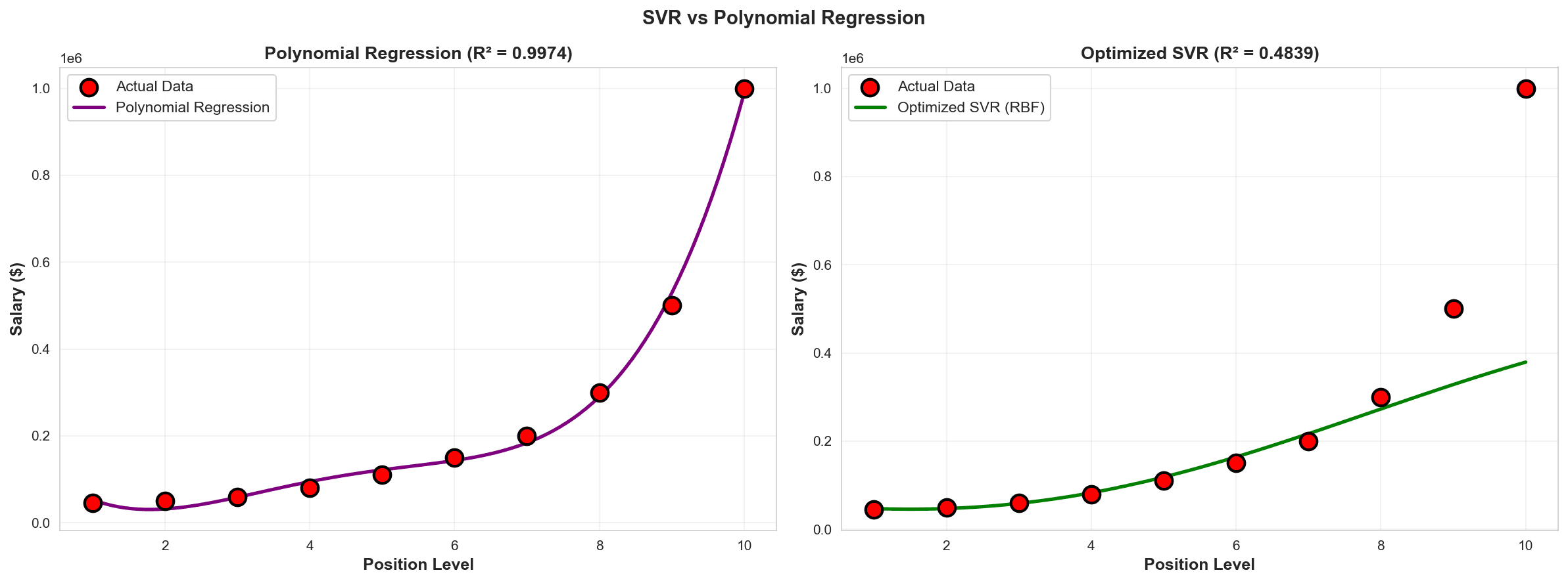 The implementation proved that a perfect statistical score isn't always the best business solution. The SVR model prioritized robustness over memorization: Avoided Overfitting: While a Degree-4 Polynomial Regression achieved a near-perfect $R^2$ of 0.9974, it was entirely warped by the $1M outlier. My optimized SVR model deliberately ignored the CEO outlier to protect the integrity of the curve. Stabilized the Mid-Market: By allowing the SVR algorithm to "miss" the CEO salary prediction (predicting ~$400k instead of $1M), the model generated highly accurate, realistic, and smooth salary predictions for Levels 1 through 8. Handled Small Data Beautifully: The RBF kernel successfully extrapolated the complex, exponential trend using only 10 data points, proving the efficiency of Support Vector Machines on small datasets.