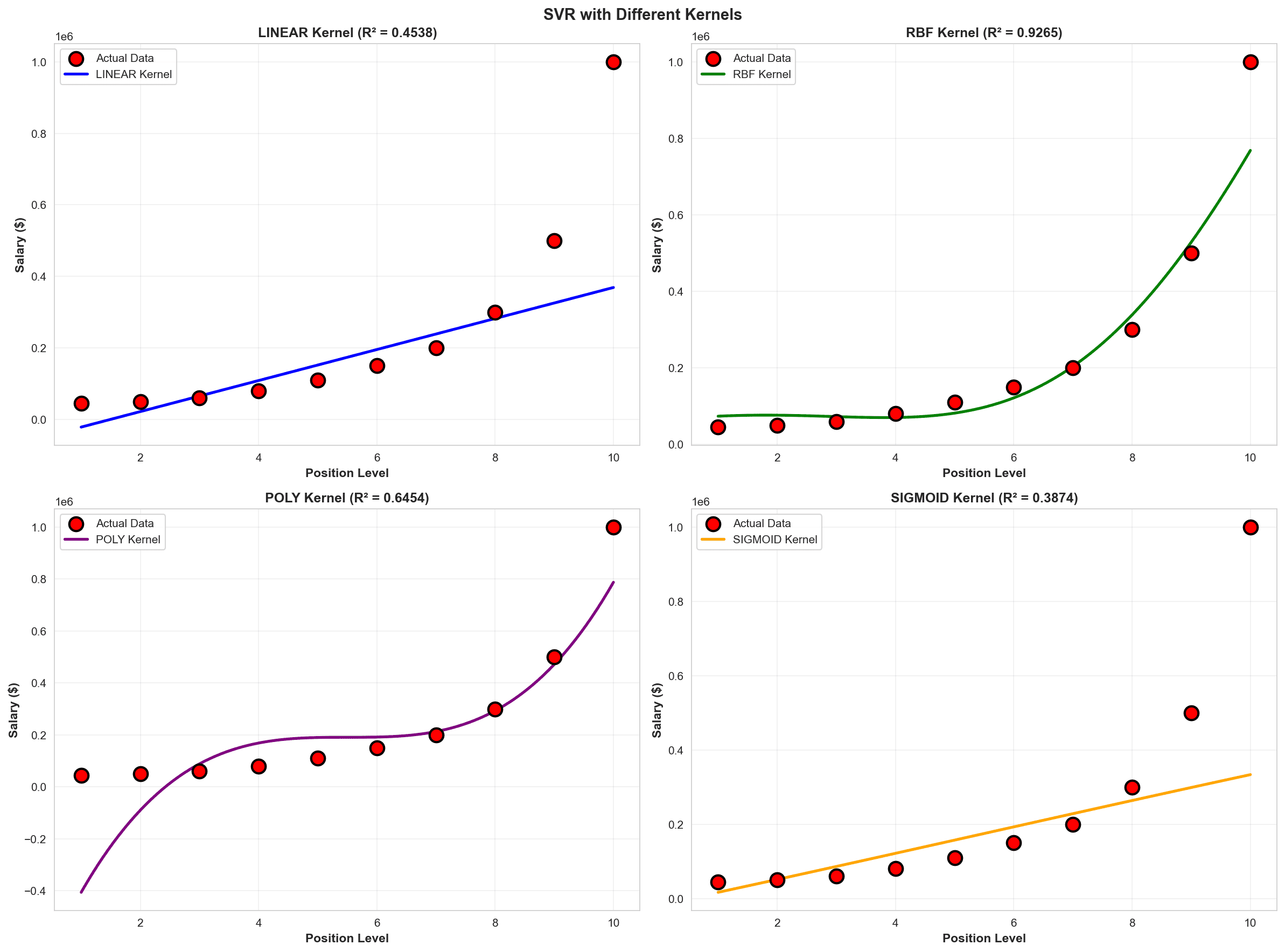 Workflow Overview: Feature Scaling: Because SVR is highly sensitive to the magnitude of features, I applied standard scaling to both the position levels and the salary figures to ensure the model processed the geometry of the data correctly. Kernel Evaluation: I tested multiple algorithmic transformations (Kernels) to project the data into higher dimensions where a linear hyperplane could separate it. Linear Kernel: Underfitted the curve ($R^2 = 0.4538$). Sigmoid Kernel: Failed to capture the underlying trend entirely ($R^2 = 0.3874$). Polynomial Kernel: Captured the curve better but risked volatility ($R^2 = 0.6454$). RBF Selection & Optimization: I ultimately selected the Radial Basis Function (RBF) Kernel, which inherently handles complex, non-linear relationships smoothly. Strategic Outlier Suppression: I optimized the SVR hyperparameters specifically to treat the Level 10 CEO salary as an anomaly.