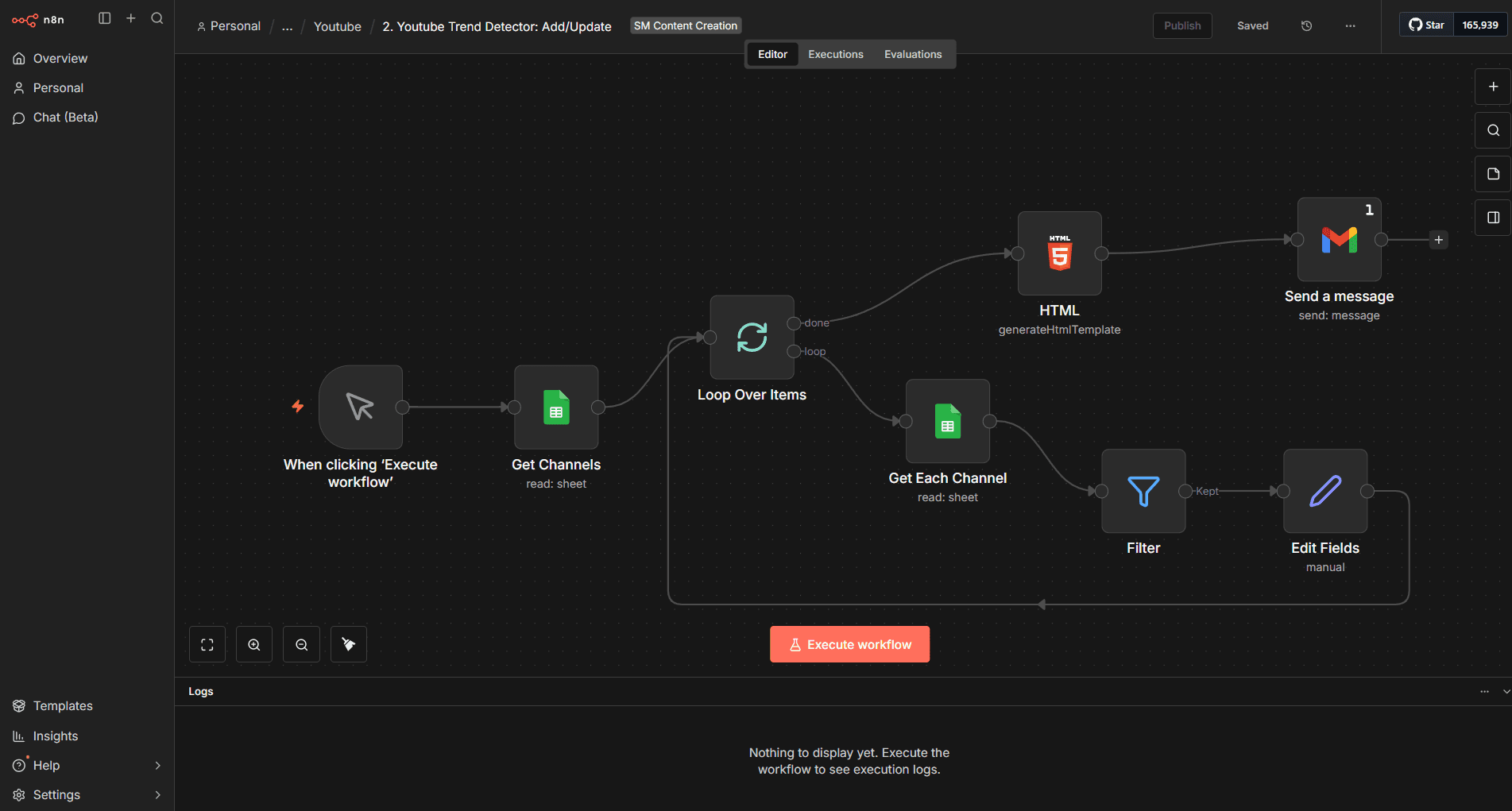 I built a YouTube Trend Detector & Daily Brief System using n8n that automatically monitors selected creators, analyzes recent videos, and delivers concise insights via email. Workflow Overview: Creator Input & Configuration User defines a list of YouTube creators or channels to monitor. Automated Video Fetching: YouTube APIs retrieve recent videos from each creator. Video metadata (views, likes, publish time, descriptions) is collected. Centralized Data Storage: All fetched videos are stored in Google Sheets for tracking and analysis. Trend Filtering & Analysis: The system filters recent uploads and identifies top-performing videos per creator based on engagement metrics and recency. Insight Generation: ChatGPT APIs analyze selected videos to extract: Content themes Title patterns Format trends Automated Brief Delivery: The top videos from each creator are compiled into a daily or weekly brief. Briefs are automatically sent via Gmail. Research Archival: Insights and reports are stored in Google Drive for historical reference.
